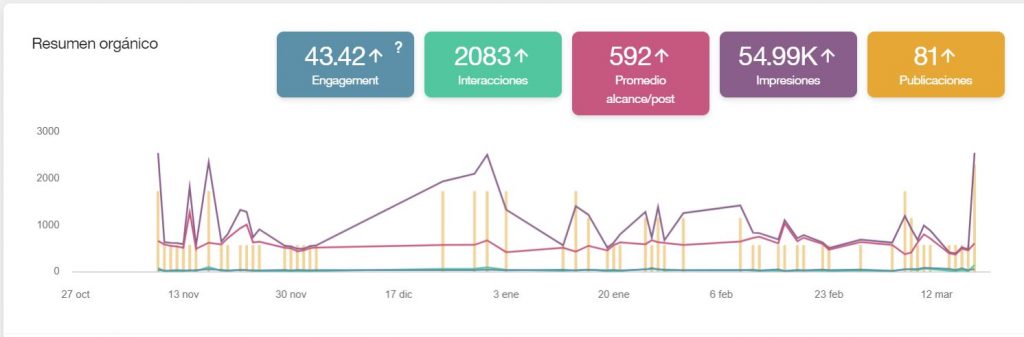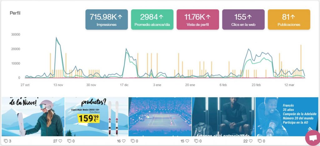 Metricool: Para terminar tenemos esta herramienta. Es muy útil a la hora de medir todos los datos de una manera sencilla y tratar de interpretar los datos. Tal como se pueden ver en las imagenes, los datos de Decathlon tienen una senda ascendente y constate. Por lo tanto, podemos decir que se ha realizado un buen trabajo.